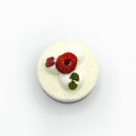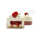 Biscuit de savoie, crème mousseline, cœur framboise passion, gel et glaçage framboise passion.